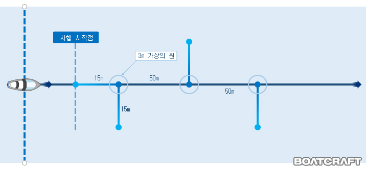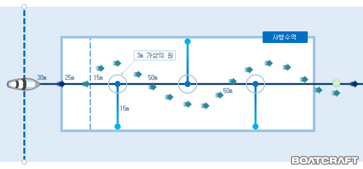 첫번째 부이 30m 전방 에서 일직선이 되도록하며